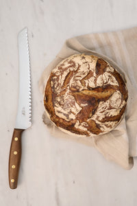 The Robert Herder KB2 bread knife from Windmühlenmesser features a hand-polished, double-sided serrated edge, making it suitable for both left-handed and right-handed users. This design allows for straight and precise slices of bread, making it an ideal choice for households with both left- and right-handed individuals. The knife has a blade length of approximately 225 mm.
